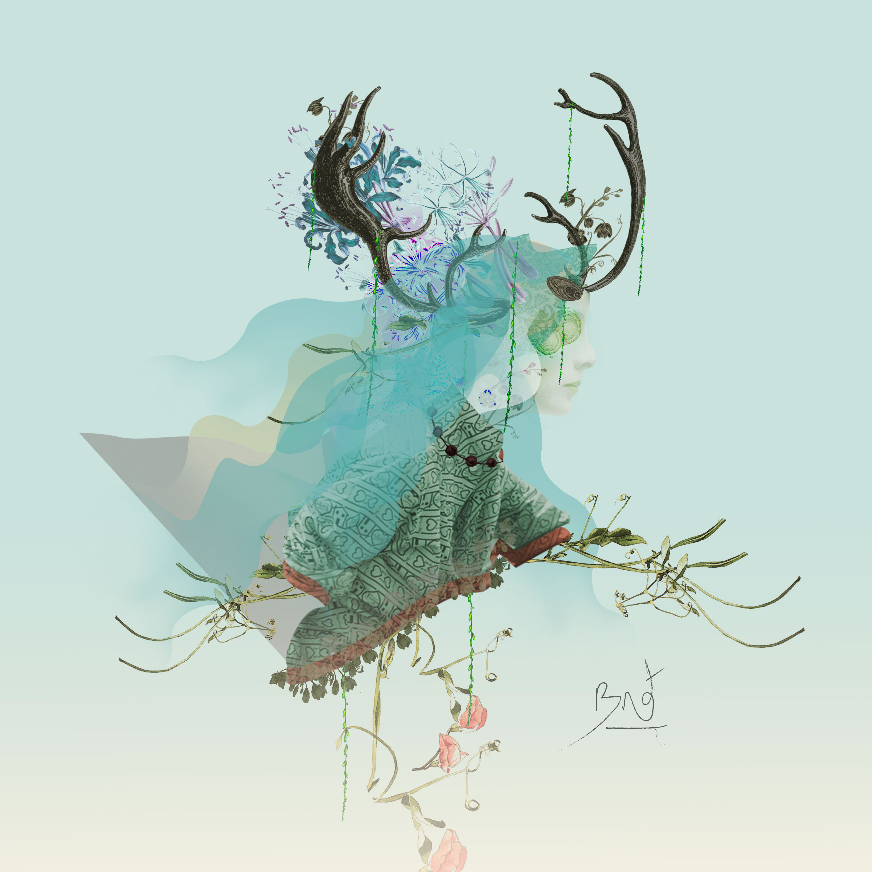 Como las banshees están relacionadas con la Muerte, quise jugar con ese concepto para crear el collage. Fui tejiendo por tanto una historia sobre La Madre Naturaleza: dónde podría estar su presencia, cómo iba a ser representada, cómo cuidaba de sus criaturas, cómo las protegía, cómo percibía la contaminación, la destrucción de sus tierras para construir plantaciones… La animación The Firebird Suite de “Fantasía 2000” (El Espíritu de la Primavera) me ayudó mucho a adentrarme en ese ambiente.